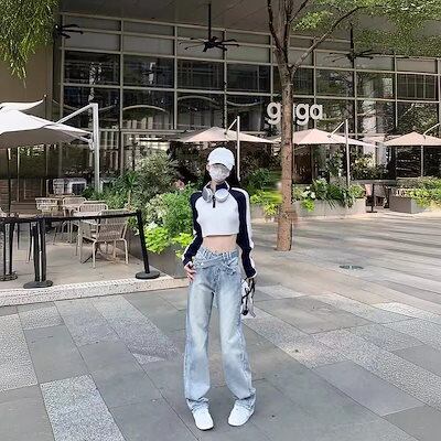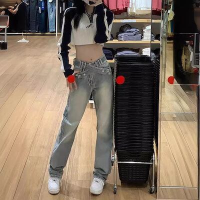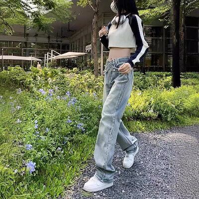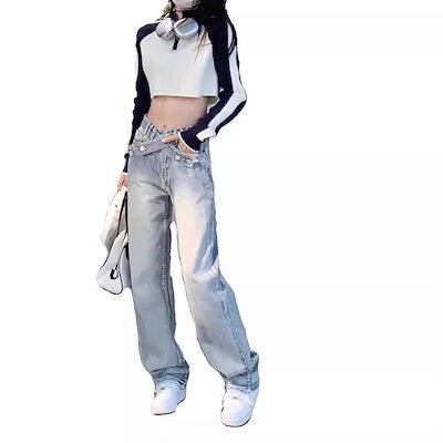 ジーンズ ハイウエスト クロスオーバー デニムパンツ レディース 春秋 新作 ニッチ デザイン ルーズ パンツ ?国ファッション