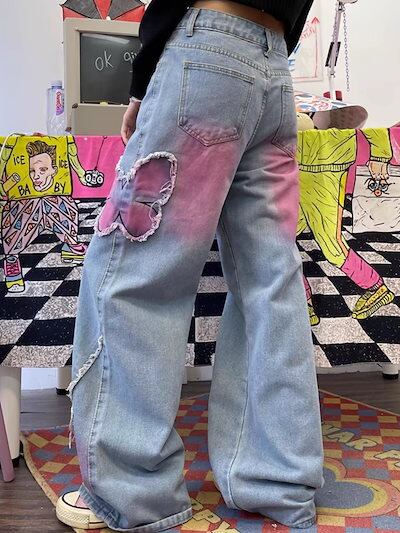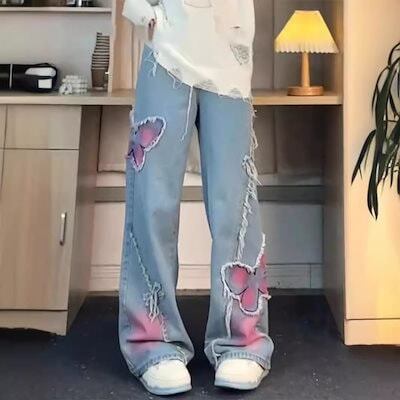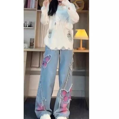 ジーンズ ヴィンテージ バタフライ ハロ ジーンズ レディース 2025春 新作 スパイス・ガールズ ハイウエスト ウォッシュド ストレート カジュアル モップ掛け ズボン ?国ファッション