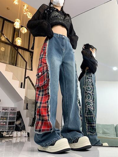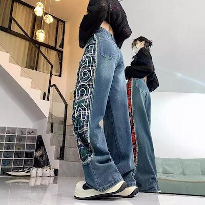 ハイストリートジーンズ リアル チェック柄 パッチワーク パーソナリティ 手紙 ジーンズ レディース 新作スタイル ストレート ワイドパンツ ローエッジ パンツ ハイストリート ブルー ?国ファッション