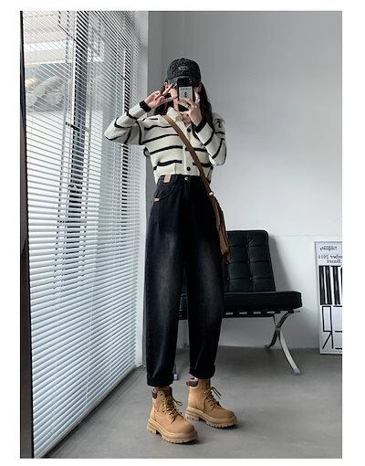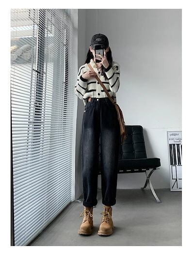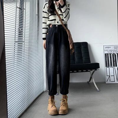 韓国ファッション デニムパンツ ギャザージーンズレディース秋冬新作ハイウエストビッグサイズで痩せ見えワイドパンツ