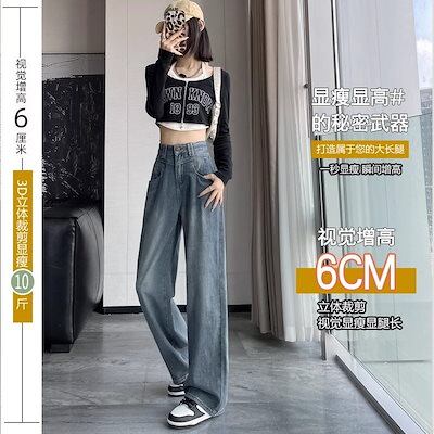 デニム スターパターンワイドレッグジーンズレディースファッション新作ハイウエストナローストレートパンツ