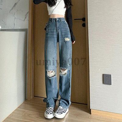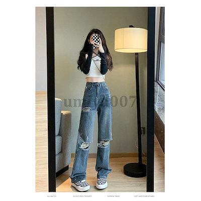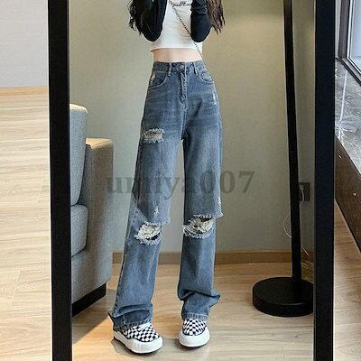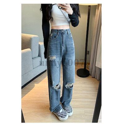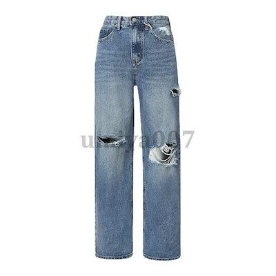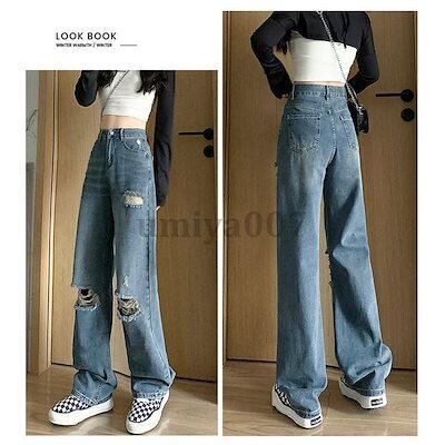 【 新作】ワイドパンツ デニムパンツ レディース ハイウエスト ダメージパンツ デニムDenim ロングパンツ 秋 ゆったり パンツ
