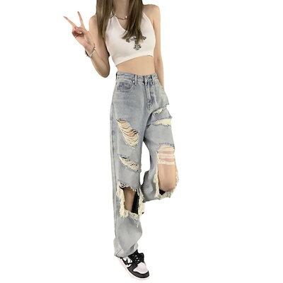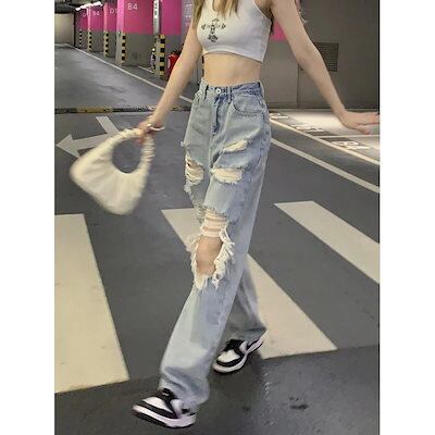 ジーンズ レトロ ウォッシュド 水色 穴 デニムパンツ レディースジーンズ 新作 ルーズ 薄手 ストレート ワイドパンツ ファッション