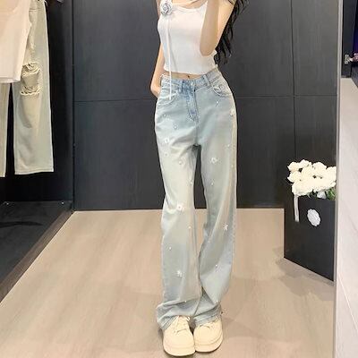 【長期在庫】レディースデニムストレートパンツ春夏新作ゆったりスリム万能ビーズ細身フロア丈パンツ