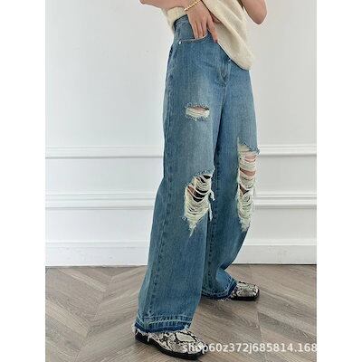 スポット2025春夏新作ニッチデザインルーズ感万能リップド起毛ストレートジーンズワイドレッグパンツレディース