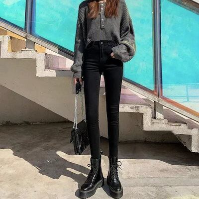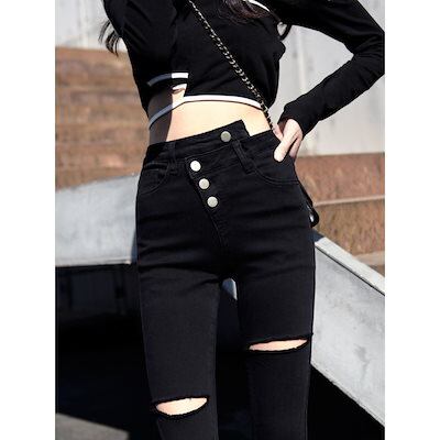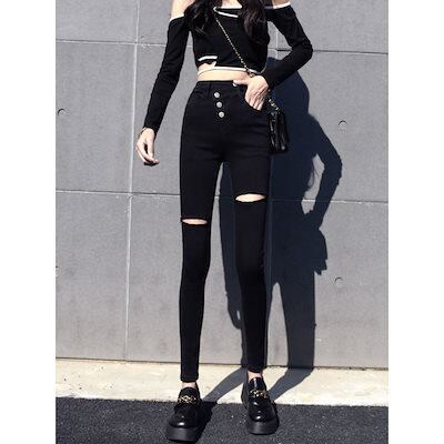 韓国2025春夏新作黒薄手アウタータイトスキニーパンツハイウエストホールジーンズレディース