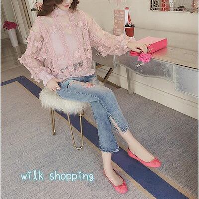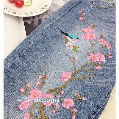 デニムパンツ レディース スキニー 刺繍 花柄 スリット ボトムス ジーンズ ストレッチ 伸びる 細身 アンクル丈 美脚 カジュアル スリム 薄手 秋