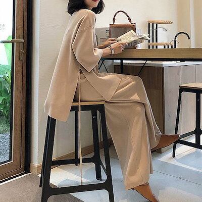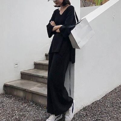 レディース 上下2点セット ニット Vネック ワイドレッグパンツ アンクルパンツ カジュアル 可愛い フェミニン きれいめ 上品 エレガント おしゃれ お出かけ オフィス お呼ばれ ベージュ ブラッ