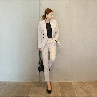 チェック柄スーツ セットアップ レディース ビジネス アンクル丈 テーラードジャケット パンツスーツ 2点セット スリム カジュアル キュート 可愛い フェミニン きれいめ 上品 エレガント お出かけ