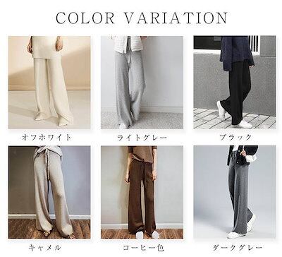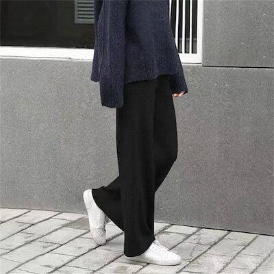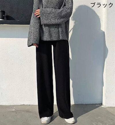 ワイドパンツ レディース ロングパンツ ニット 無地 厚手 ロング パンツ ゆったり ハイウエスト 無地 厚手 着痩せ アンクル 大人 カジュアル ウエストマーク リボン ボトムス チノパン 体型カバ