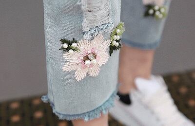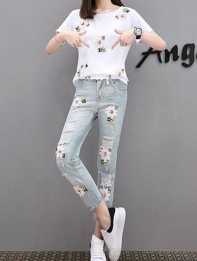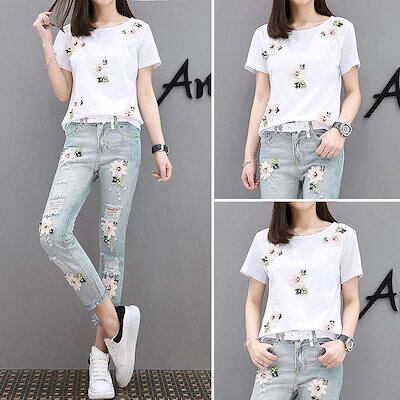 レディース セットアップ カットソー&デニムパンツ 花柄 モチーフ 半袖 アンクル丈 ダメージ クロッシュ カジュアル 大人可愛い ラフスタイル フェミニン お出かけ デート デイリー ホワイト