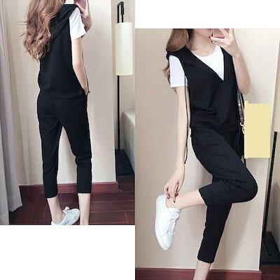 レディース セットアップ 深Vネック フード付ベスト 半袖 Tシャツ アンクル丈 パンツ 無地 ラウンドネック きれいめ 大きいサイズ カジュアル 清楚 エレガント 大人可愛い フェミニン オフィス