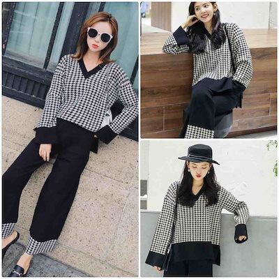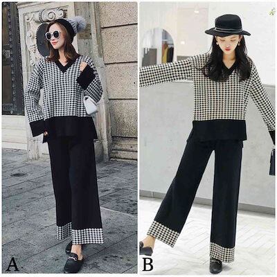 レディース 2点上下セット ニット 千鳥格子 チェック柄 Vネック アンクルパンツ ゆったり 長袖 カジュアル 可愛い フェミニン きれいめ 上品 エレガント おしゃれ お出かけ オフィス お呼ば
