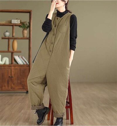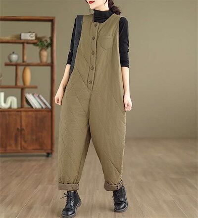 中綿入りサロペット防寒 つなぎ レディース おしゃれ オールインワン ビッグシルエット オーバーサイズ カバーオール ワイドパンツ 作業服 作業着 オーバーオール 一体服 ノースリーブ 春秋冬 体型カ