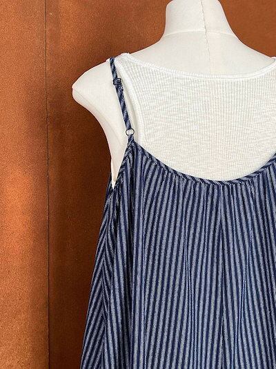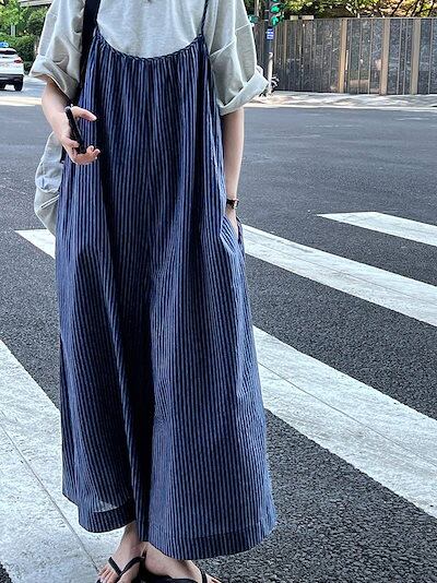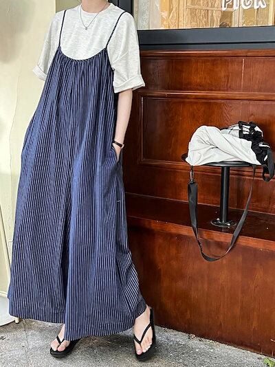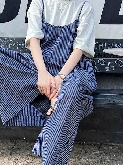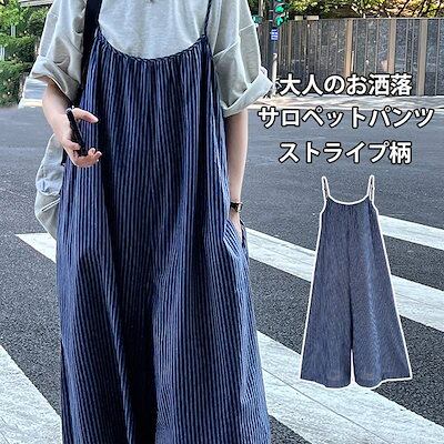 サロペット パンツ ストライプ柄 レディース 夏 オールインワン ワイド 綿 春 キャミサロペット 涼しい 薄手 重ね着 サロペ ワイドパンツ ボトムス 体型カバー レイヤード キャミソール オーバー