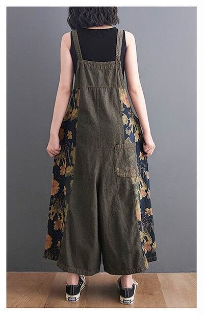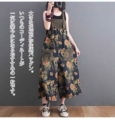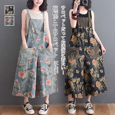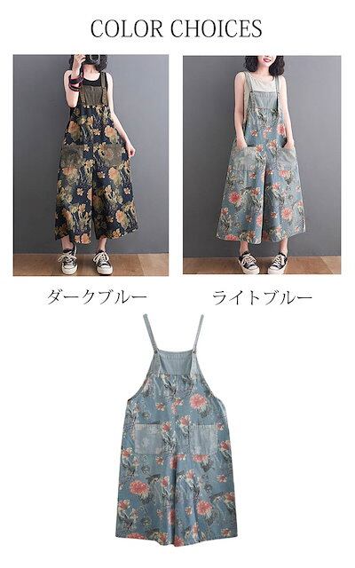 オールインワン デニムサロペット パンツ レディース 花柄 デニム サロペット ポケット付き ワイドパンツ 春 夏 秋 ボトムス 重ね着 ゆったり 体型カバー ジャンパースカート レイヤード オーバー
