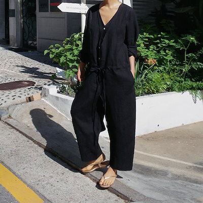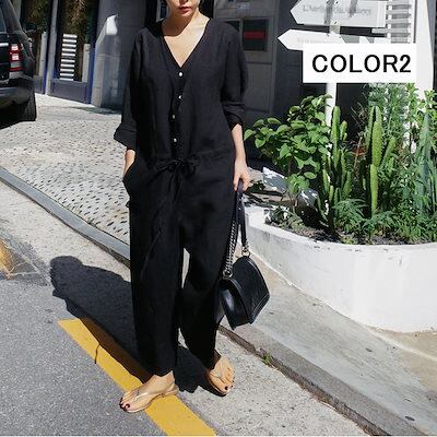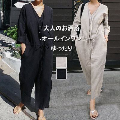 オールインワン レディース つなぎ 長袖 ツナギ ワイドパンツ オーバーオール ロングパンツ vネック 体型カバー 長ズボン ゆったり 連体服 ジャンプスーツ 脚長 春 夏 秋 着痩せ ワイド