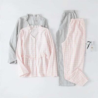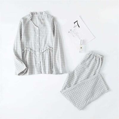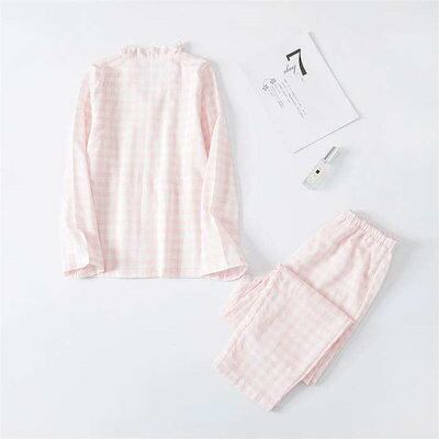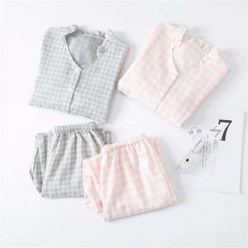ガーゼ パジャマ レディース ルームウェア パンツ 春 秋 ガーゼコットン キーネック フリル チェック 春秋 長袖 ダブルガーゼ 2重ガーゼ 綿 部屋着 セットアップ 2点セット ナイト 寝間着 寝