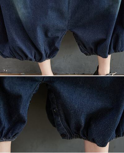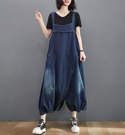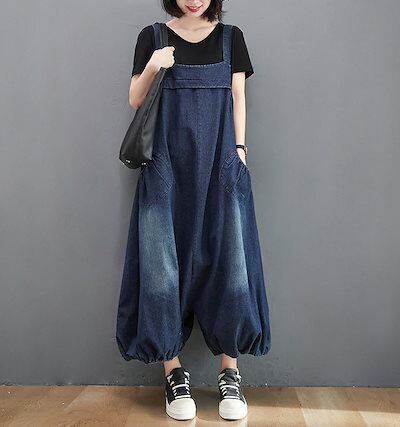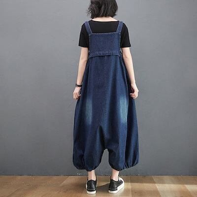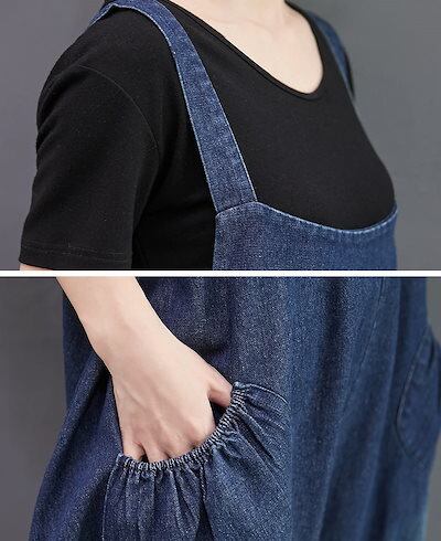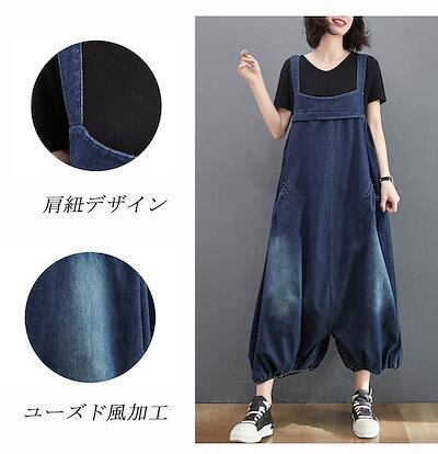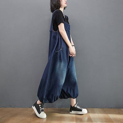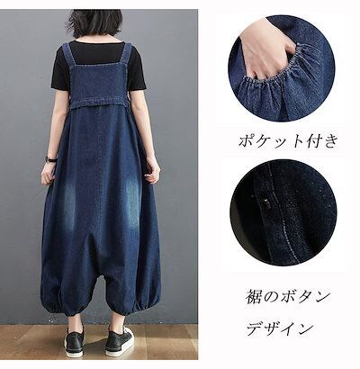 デニム サロペット パンツ レディース 春 夏 秋 オールインワン ポケット付き バルーンパンツ パンツ 無地 ボトムス 重ね着 ギャザー ボタン ジャンパースカート ロング ゆったり 体型カバー サ