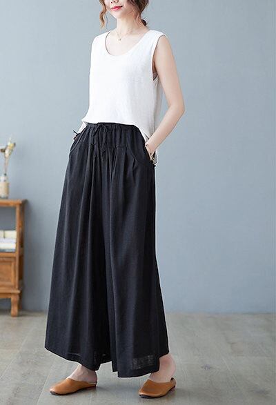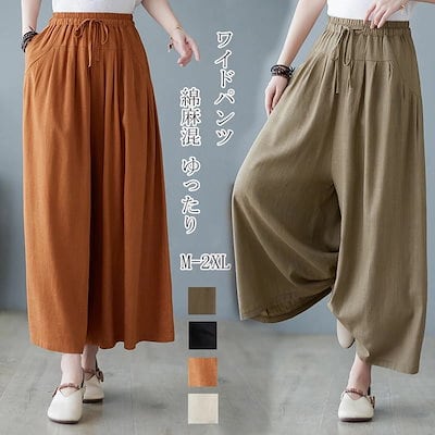 ワイドパンツ レディース 綿 麻 ガウチョパンツ 春 夏 9分丈 リボン ウエストゴム パンツ ポケット付き ハイウエスト コットン ゆったり オフィス ボトムス ワイド 無地 ブラック リネンパンツ