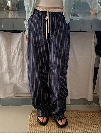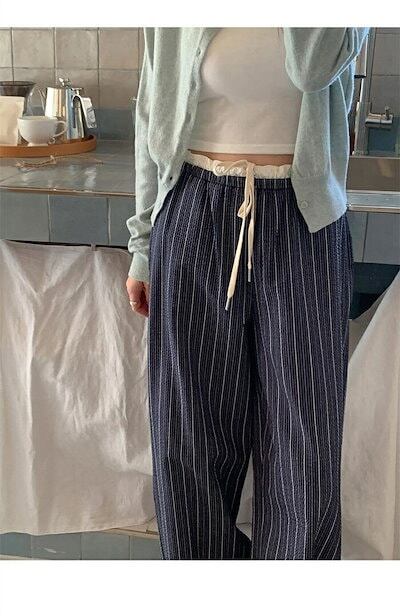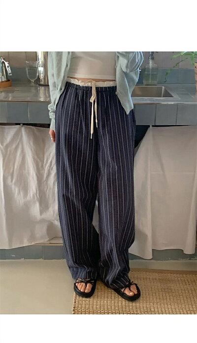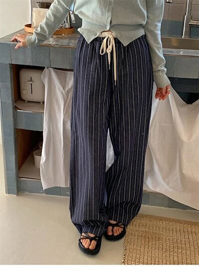 ワイドパンツ ストレートパンツ レディース ストライプ柄 ロングパンツ レース切替 ガウチョパンツ パンツ ボトムス イージーパンツ ストライプ ウェストゴム ハイウェスト 春夏 ゆったり カジュアル