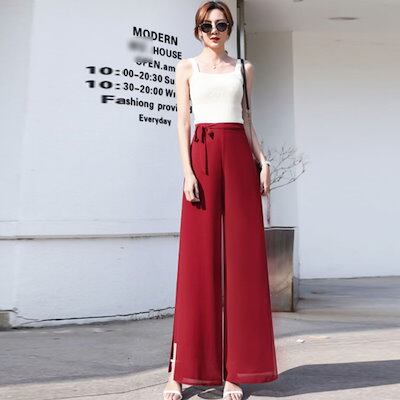 丈が選べる スリット入り シフォンパンツ ワイドパンツ ウェストリボン レディース ガウチョパンツ スカーチョ ロング 9分丈 ズボン