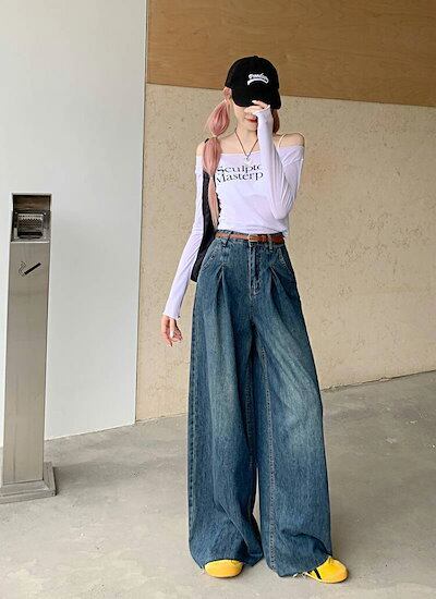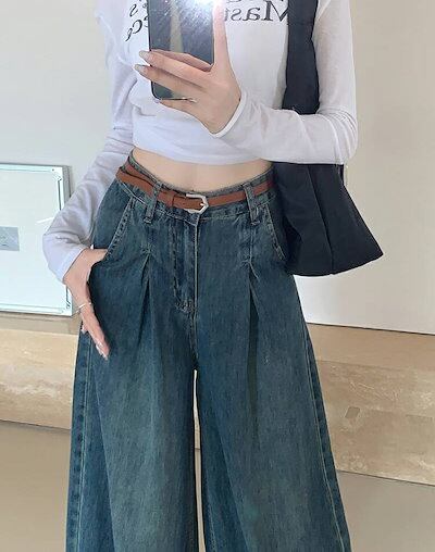 デニムパンツ ワイドパンツ レディース デニム パンツ ウエストゴム ロング丈 無地 リボン ガウチョパンツ タック ポケット付き ボトムス 体型カバー ゆったり ロングパンツ フレア カジュアル き