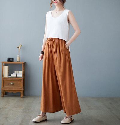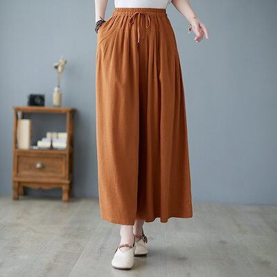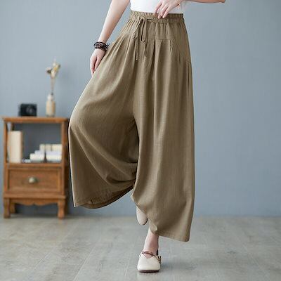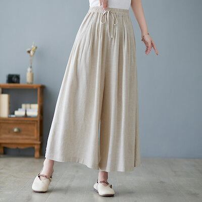 ワイドパンツ レディース 綿 麻 ガウチョパンツ 春 夏 9分丈 リボン ウエストゴム パンツ ポケット付き ハイウエスト コットン ゆったり オフィス ボトムス ワイド 無地 ブラック リネンパンツ