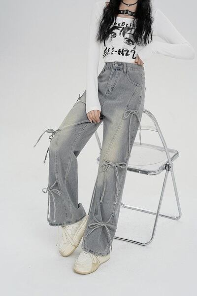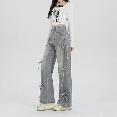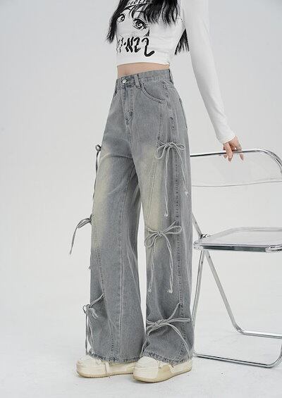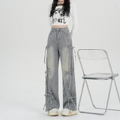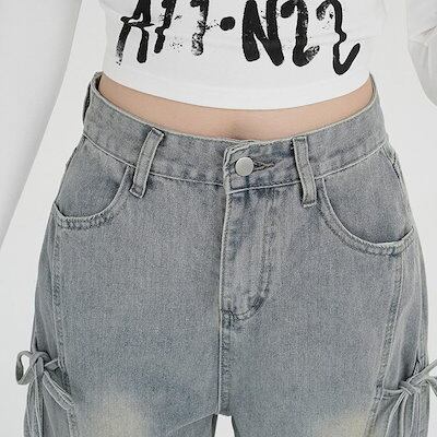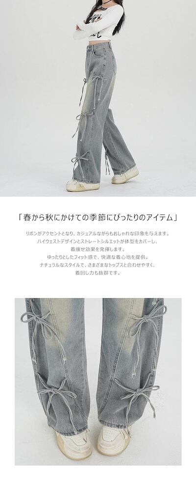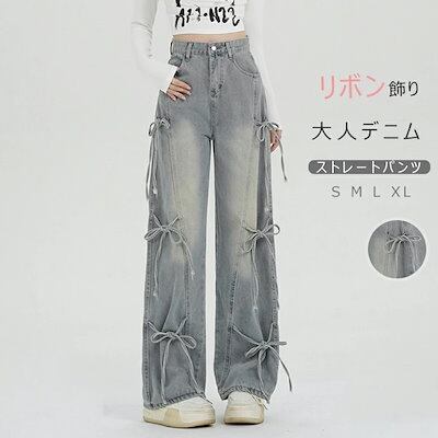 ワイドパンツ デニム リボン レディース 春 夏 秋 ガウチョパンツ ボトムス ジーンズ デニムパンツ 体型カバー ロングズボン ハイウェスト ストレートパンツ 大きいサイズ おしゃれ ゆったり カジ