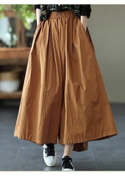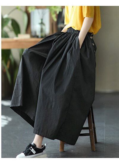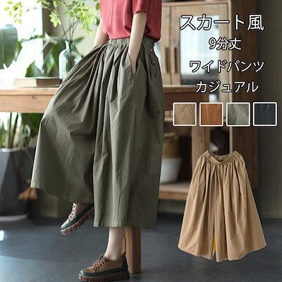 ワイドパンツ スカート風 レディース 綿 ガウチョパンツ 春 夏 ウエストゴム ハイウエスト タックパンツ 9分丈 ポケット付き ロング丈 ロングパンツ ゆったり オフィス ボトムス ボリューム ワイ