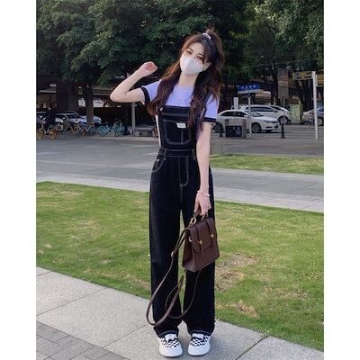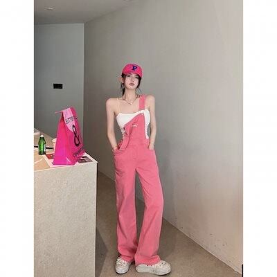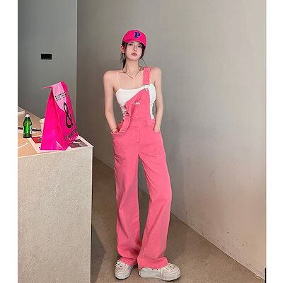 コーデ完成!サロペット年齢を感じさせないピンクデニムストラップパンツレディース2024年春秋新作ワークトラウザーズルーズハイウエストワイドパンツストレートパンツ