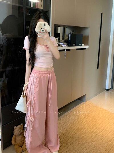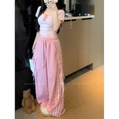 2024秋冬 パンツロング丈ストレートストライプウエストゴムワイドハイウエストゆったり 脚長効果美脚効果細見え春カジュアル黒白韓国系ファッションレディースサイドお出かけおしゃれ かわいい衣装トラック