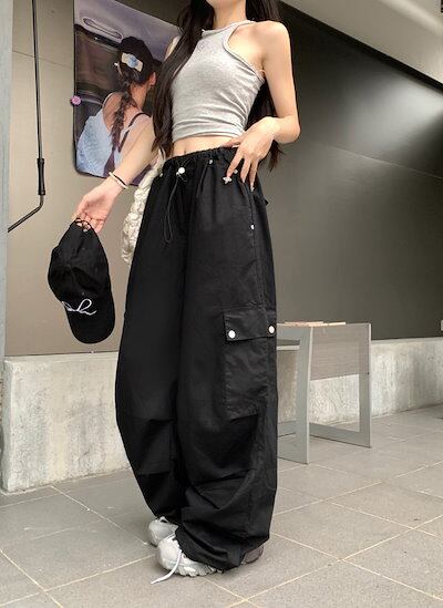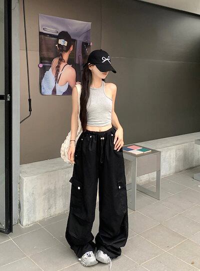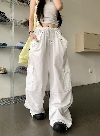 2024春夏パンツ カーゴパンツ ロング丈 ワイド ストレート ハイウエスト 美脚効果 脚長効果 細見え 夏 白 黒 おしゃれ かわいい 韓国ファッション レディース お出かけ