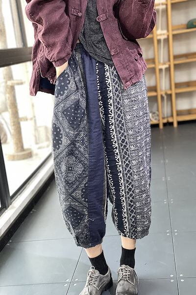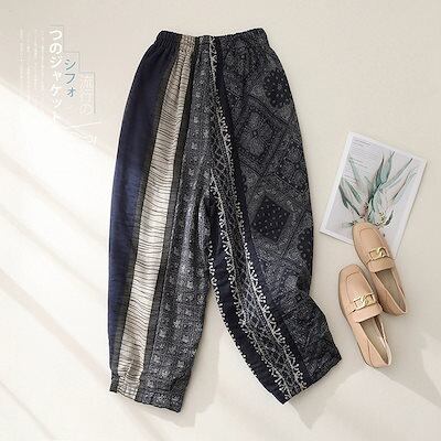 2024人気新作プリントパンツ大きいサイズレディース春服文芸風韓国ファッション ハイウエストカジュアルワイドパンツハーレムパンツ九分丈