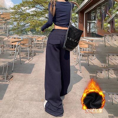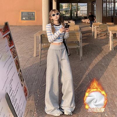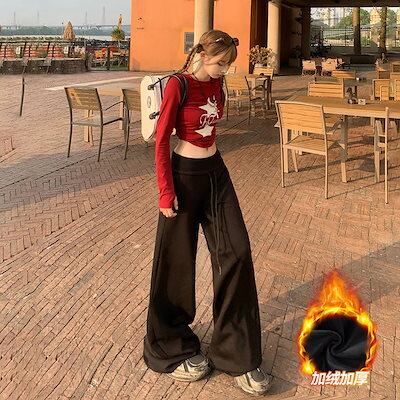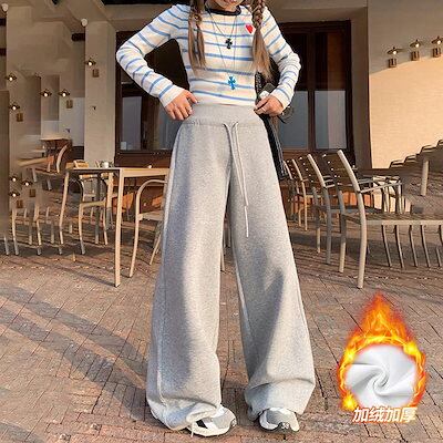 レトロなレイジードローストリングワイドレッグカジュアルパンツレディースハイウエストルーズスリムオールマッチプラスベルベットストレートパンツ