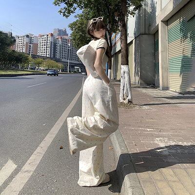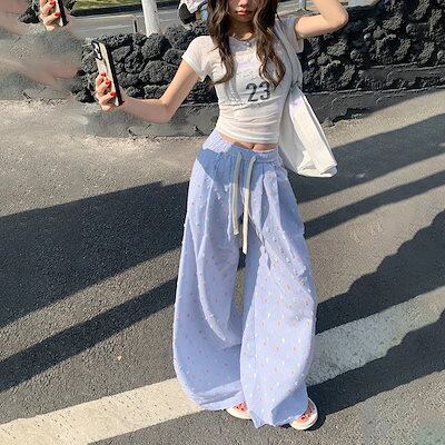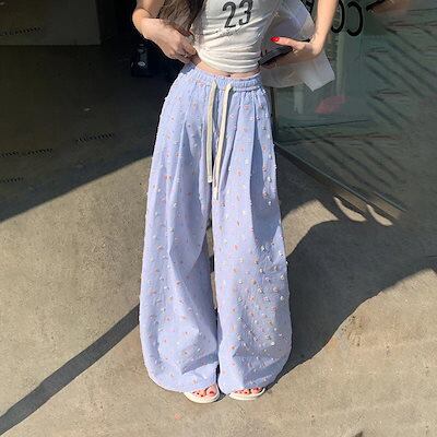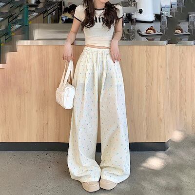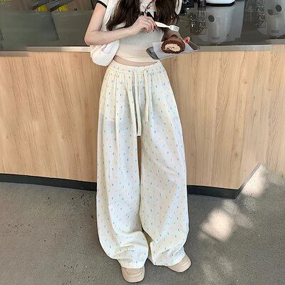 韓国風の小さな新鮮な花柄のドローストリングワイドレッグカジュアルパンツレディースゆったりスリミング年齢を感じさせないオールマッチストレートパンツトレンド