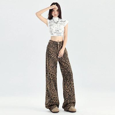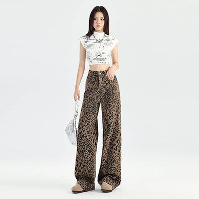 ニッチなレトロヒョウ柄ワイドレッグジーンズレディースハイウエストゆったりスリム個性的オールマッチストレートフロアレングスパンツ