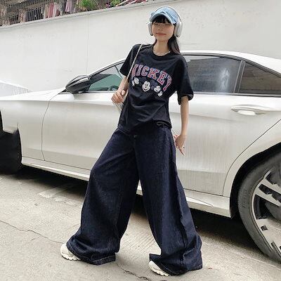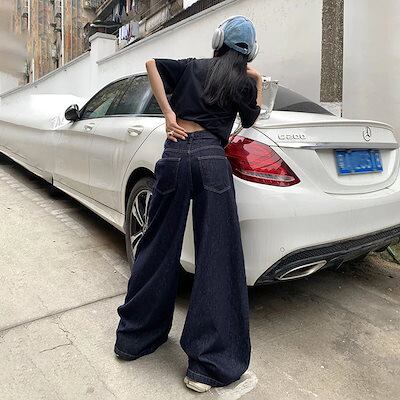 シティガールのゆったりワイドレッグジーンズレディースハイウエストスリムで肌をカバーオールマッチのストレートレッグフロアレングスパンツ