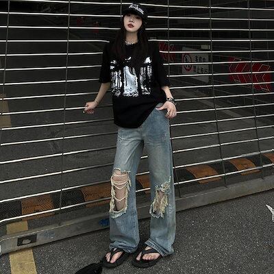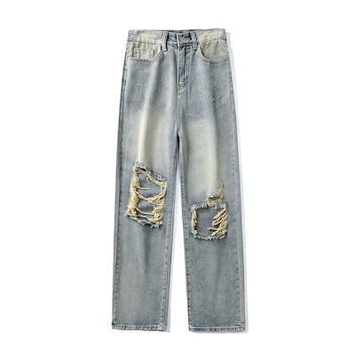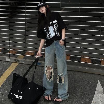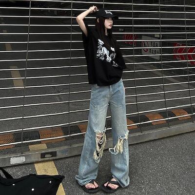 大きな穴のあるレディースハイウエストルーズストレートレッグパンツ