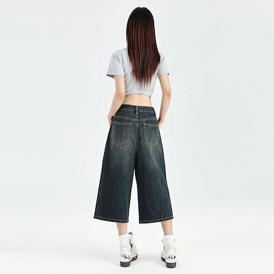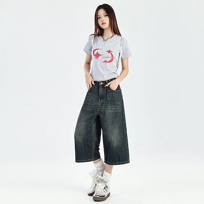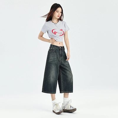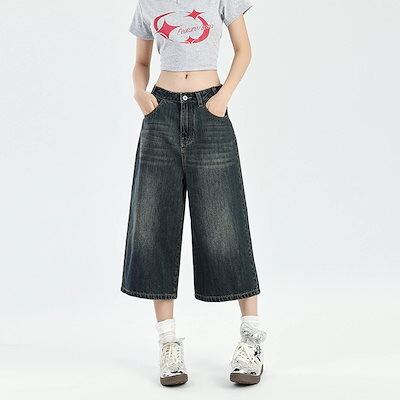 レトロなワイドレッグクロップドジーンズレディースハイウエストルーズスリムカジュアルオールマッチストレートミドル丈パンツトレンディ