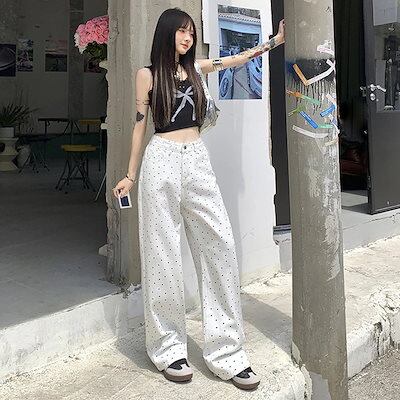 ゆったりとした水玉模様の小花柄ワイドレッグジーンズレディースハイウエストゆったりスリムオールマッチストレートパンツ