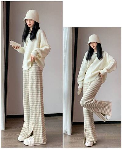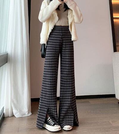 ニットパンツ レディース 伸縮性 ストレッチ 裾スリット ワイドパンツ フレアパンツ ニット 千鳥柄 厚め 暖かめ 保温性 おしゃれ きれいめ 春秋冬 ロングパンツ ボトムス 体型カバー 着痩せ ロン
