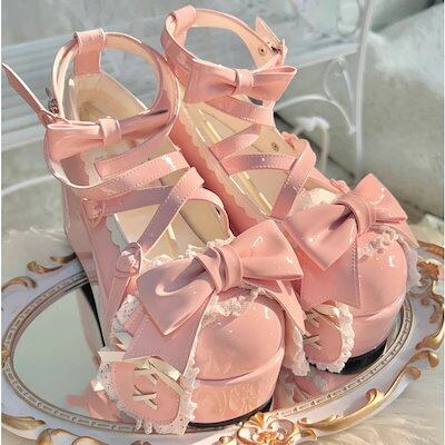 24新作 Lolita靴 靴ハイヒール厚底ブラックバレエ風靴オリジナルロープリンセス靴 メガ割 スタイルアップヒールパンプス