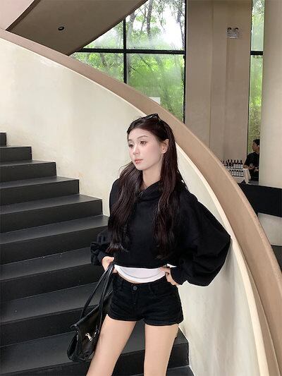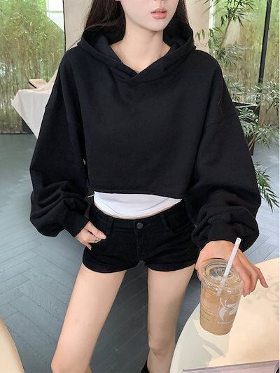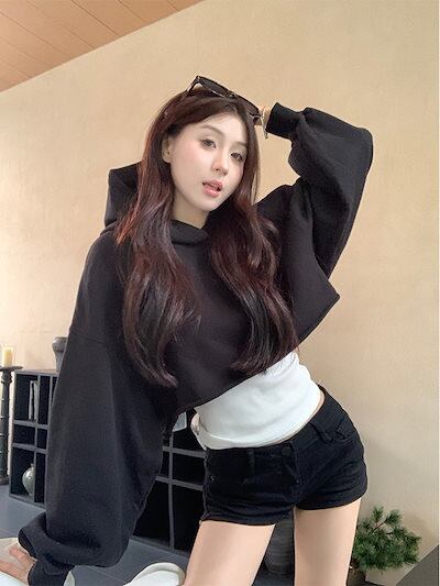 2024 秋冬トップス フード付き スウェット 長袖 丈短め 秋 黒 ブラック おしゃれ かわいい 韓国ファッション レディース お出かけ
