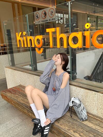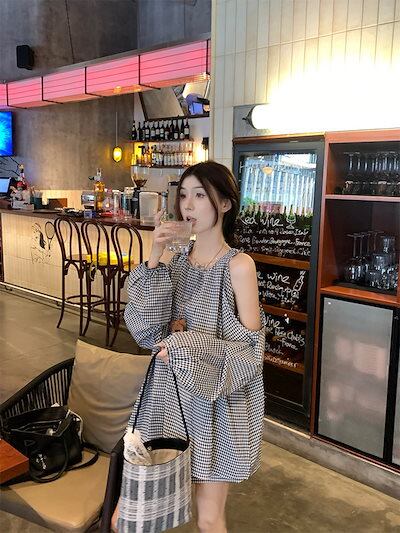 2024秋冬セットアップ トップス シャツ ラウンドネック ギンガムチェック オープンショルダー ショートパンツ ワイド ゆったり 秋 黒 ブラック おしゃれ かわいい 韓国ファッション レディース