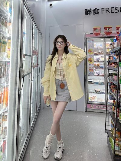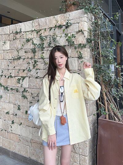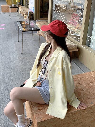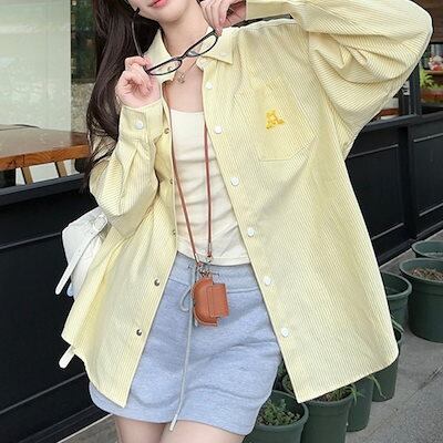 2024秋冬トップス シャツ 長袖 ストライプ ボタン 襟 ゆったり 秋 黄色 イエロー おしゃれ かわいい 韓国ファッション レディース お出かけ