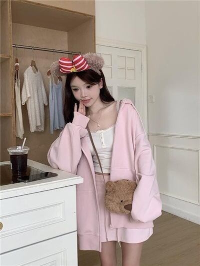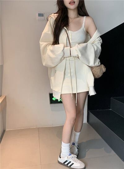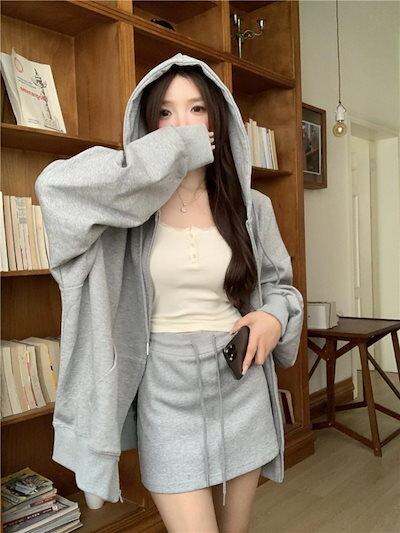 2024秋冬セットアップ アウター パーカー フード付き ジップ チャック 長袖 大きめサイズ ゆったり スカート ミニ丈 秋 白 おしゃれ かわいい 韓国ファッション レディース お出かけトラック