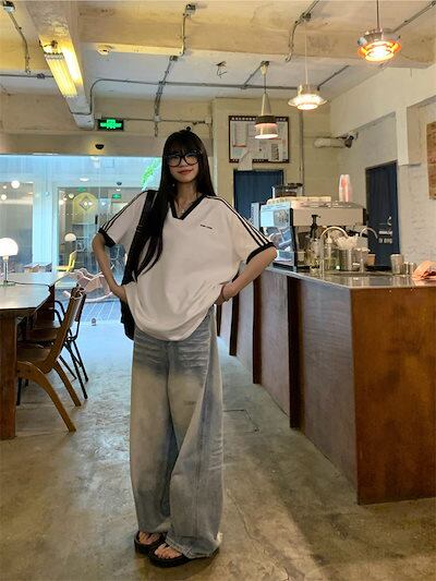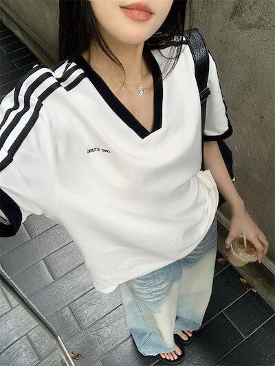 2024夏 韓国可愛い風トップス Tシャツ ロング丈ファッション 半袖スリムフィット サイド ペイントシルエット ゆったり 休日レディースサイズ韓国系ネック_おしゃれ カジュアル メンズライク T