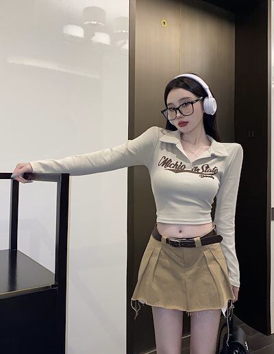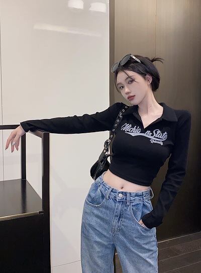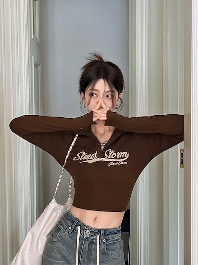 2024秋 長袖 Tシャツ ショート丈 カットソー トップス カジュアル 配色韓国系ストリートへそ出しK-POPタイトネックスリーブ 肌見せ T ファッションレディース かわいいハーフ衣装風冬トップス