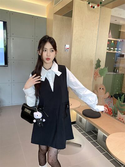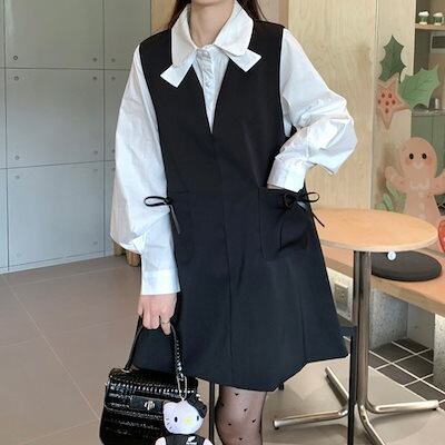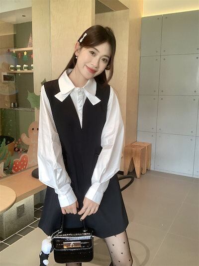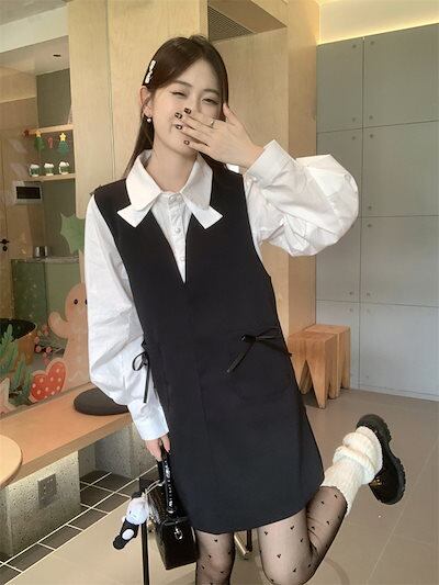 2024秋冬2点セット ワンピース ミニ丈 ジャンパースカート ジャンスカ Vネック リボン トップス シャツ 長袖 秋 白 黒 おしゃれ かわいい 韓国ファッション レディース お出かけ